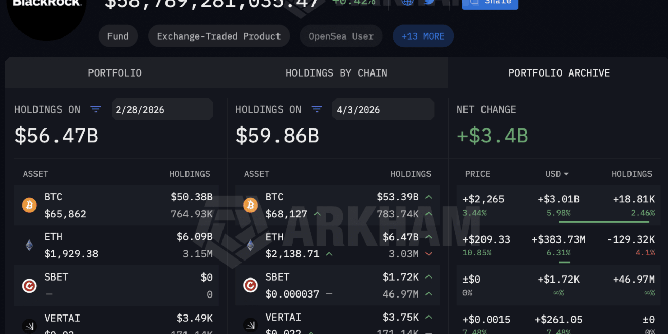 The BlackRock crypto fund currently holds approximately $53.39Bn in Bitcoin, according to the real-time wallet dashboard on Arkham Intelligence at the time of writing (April 3).