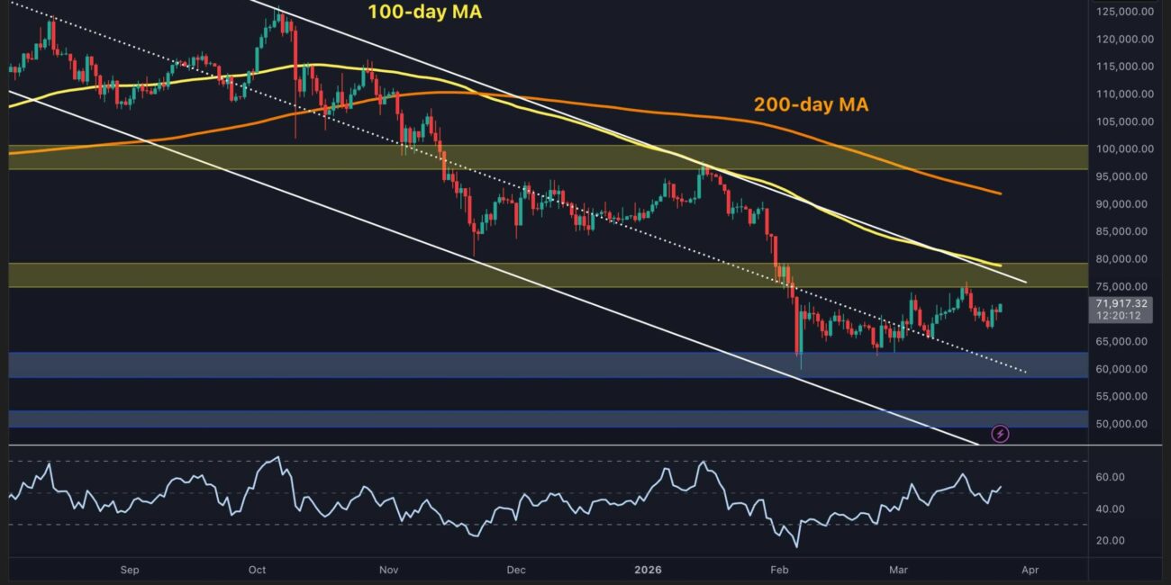 The RSI on this timeframe has also bounced from the low-30s and is trending upward above 60, suggesting short-term buying pressure is building. A decisive break above the triangle’s upper trendline and the $75K resistance band would be a meaningful short-term bullish signal, while a breakdown below $62K would likely send the price below the February support zone and continue the overall downtrend.