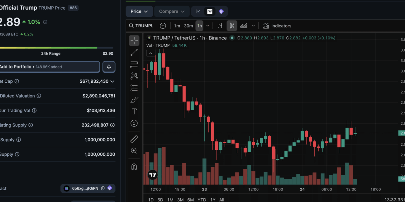 TRUMP is trading today at $2.85, up a modest +1% on the day, with a 24-hour trading volume of $103M, and a market cap of $670M, making it the 86th-largest digital asset by valuation.